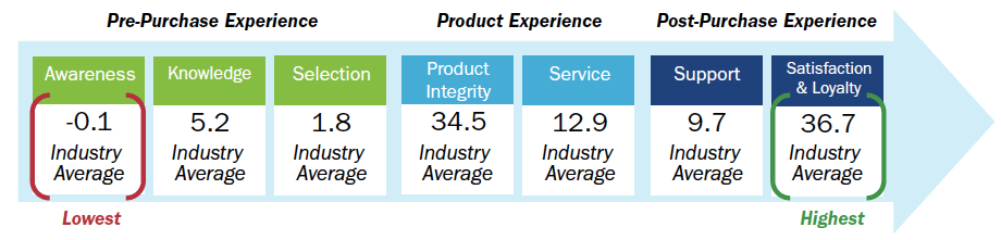 On a positive note for suppliers, industry averages for the product experience and post-purchase experience were relatively high and presented an increase of the industry averages since our previous 2016 publication. Many of the touchpoints found in these parts of the overall experience are also of great importance to customers. However, several touchpoints of the pre-purchase experience are equally as important to customers, and our data shows life science suppliers on average are failing to satisfy during those crucial touchpoints.