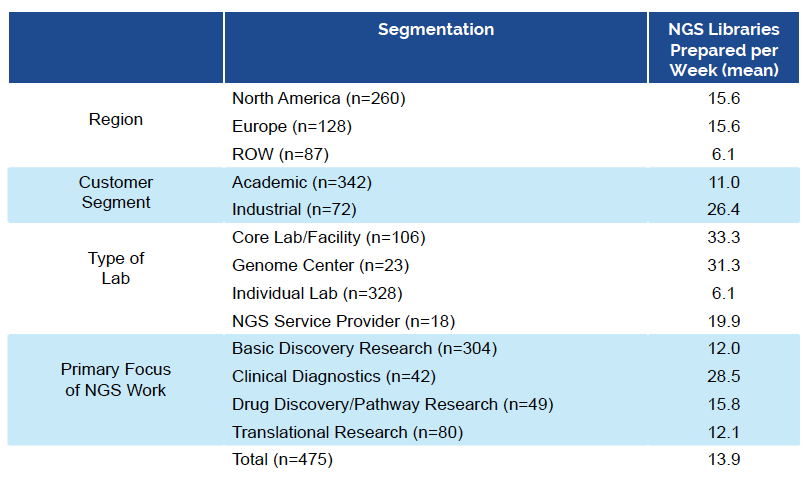 Providers of NGS services—broadly defined to include core labs/ facilities, genome centers and NGS service providers—are a dominant and influential customer in this market. In a recent NGS market study we conducted, one-third of our respondents identified themselves as working in a lab that provides NGS services. By our estimation, these labs prepare two-thirds of the NGS libraries.